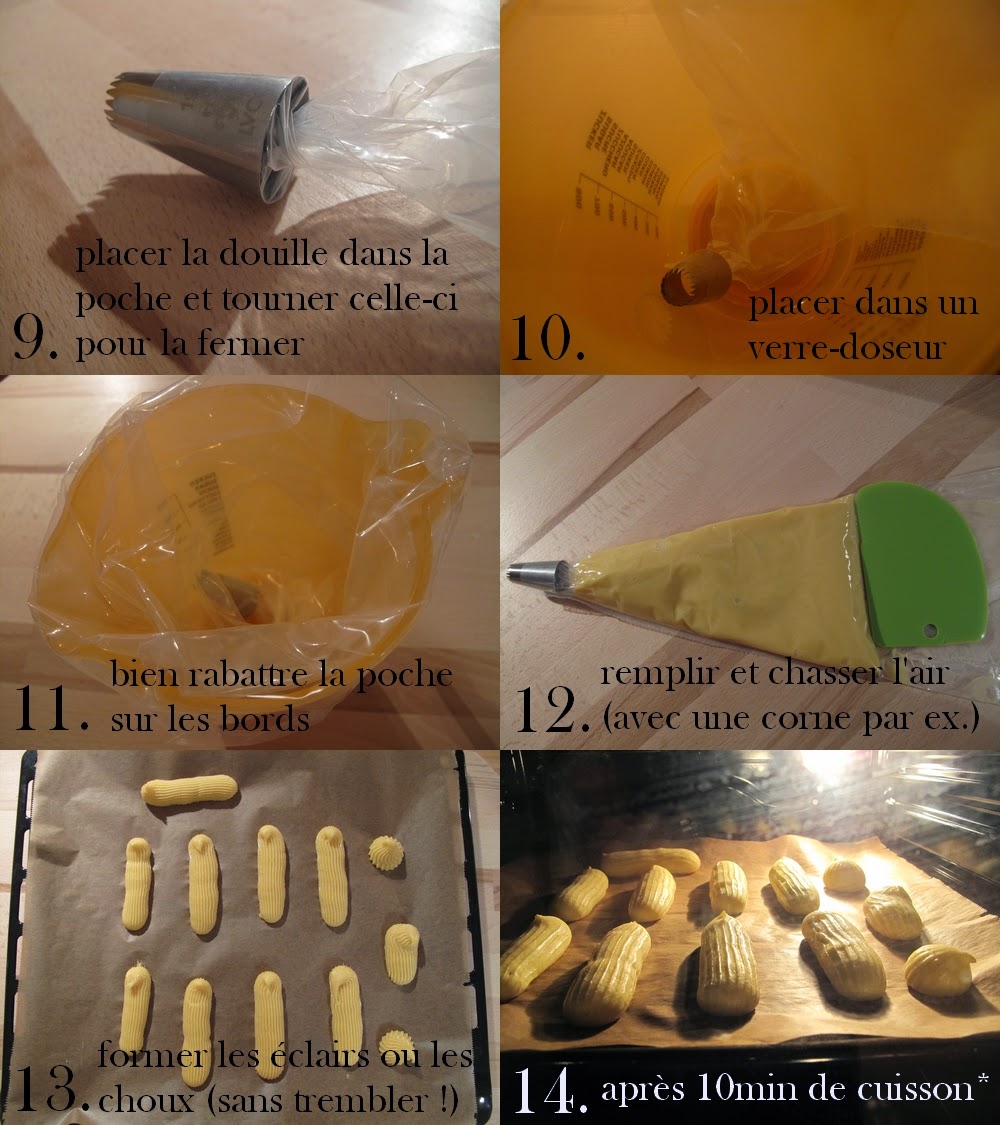 - On remplie la poche à douille (étapes 9 à 11). Super technique pour ne pas perdre un gramme de pâte : bien rassembler la pâte à l'aide d'une corne (ou de tout autre objet ressemblant ! Quand je n'en avais pas j'utilisais une pochette de CD...). Il est recommandé d'utiliser une douille cannelée pour les éclairs (pour la taille, ça dépend du résultat souhaité).